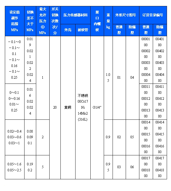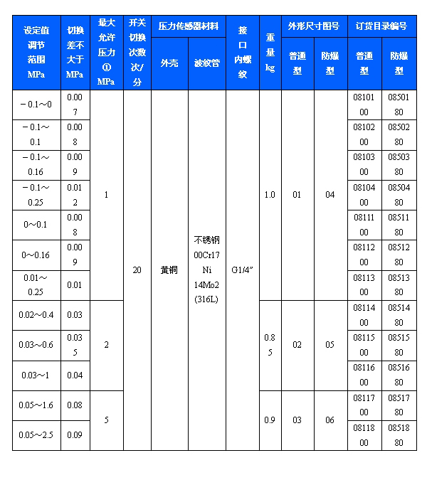 502/7D防爆壓力開關(guān)可用于真空。有特殊要求的,可另行設(shè)計調(diào)節(jié)范圍-0.1~6.3MPa。