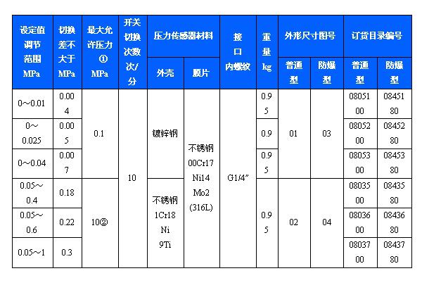 501/7D壓力開關(guān)采用膜片式的傳感器,部分規(guī)格傳感器外殼材料是不銹鋼,可用于腐蝕性介質(zhì),也可用于空氣、氣體、水蒸汽等中性氣體和油等液體介質(zhì)。501/7D壓力開關(guān)的設(shè)定值可調(diào),調(diào)節(jié)范圍0~1MPa。